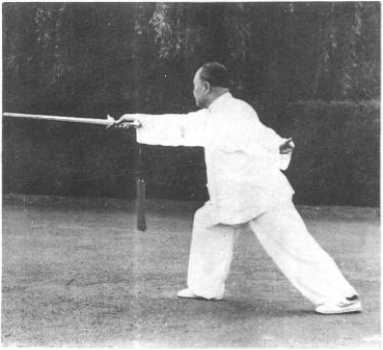 至正前方。左臂相应 地由前而后往下,置 左后。面向正西,眼向 前看(图109)。