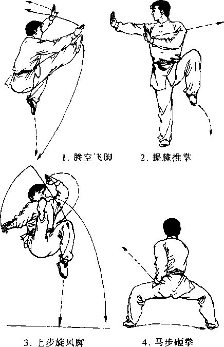 1949年中华人民共和国成立后,长拳被列为 武术竞赛的重点项目之一。内容有甲组、乙组规定 套路和用于竞赛的自选套路,以及作为普及教材 的初级刀、枪、剑、棍、拳、青年拳、少年拳等。目前长 拳内容包括基本功、单练套路、对练套路。单练套 路又分为:规定套路和自选套路两种。长拳运动量 大、结构复杂,对提高人体机能、发展人体素质具 有良好作用。以下为长拳的几个动作节选: