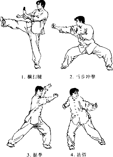 侠家拳主要流行于广州、南海、顺德及香 港、澳门等地。拳分初、中、高三级:初级拳有小 罗汉;中级拳有虎鹤相斗;高级拳有大罗汉。还 有侠家刀、侠家枪(左把枪)、九点十三枪响棍 等器械套路。其主要步型有弓步、横弓步、马 步、虚步、幵立步、跪步、扭马步、仆步、女字步 等;步法有三角马、摆步和铲马等。手型有拳、 掌、指、爪、勾、凤眼拳等;手法有抛拳、冲拳、以 冲锋抛拳为主;腿法有前蹬、后蹬、正踩、侧踹、 打腿、斜飞踢等。基本特点是:拳法刚烈、威 猛。动作长桥大马,大开大合,以发长劲、抛劲 为主。以下为侠家拳的几个动作节选: