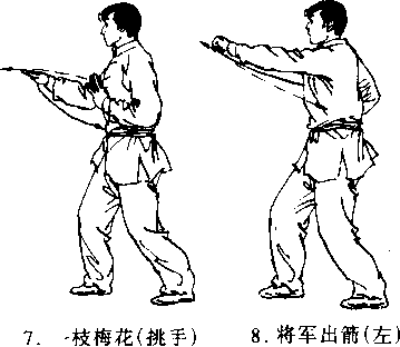 咏春拳的主要特点是:动作朴素,招法实 用,手法丰富多变,起脚必配手,发腿隐蔽,出 手护中。短桥手,上拦下抜,连消带打,贴身靠 打。以下为咏春拳的几个动作节选: