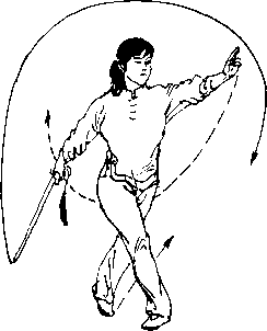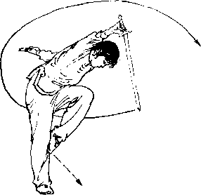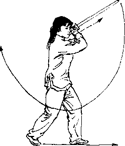 ① 右脚向前上步,屈膝,脚尖外撇,重心前 移;剑尖下落,与膝同高,左剑指直臂向上、向 前划弧,与头同高,虎口向;目视剑指。(图 2)② 右腿直立支撑,脚跟右转,左腿屈膝向 前提起;上体前倾;右手握剑向上、向前挂剑, 剑尖与膝同高,左剑指向下、向后摆起,与肩同 高,手心向上;目视剑尖。(图2)③ 左脚向前落步,稍屈膝,脚尖外撇,右腿 稍屈膝,脚跟离地;右手握剑继续向下经体左145侧向上挂剑,剑尖高于头,左剑指下落屈肘附 于右腕处;目视前方。(图2〇)