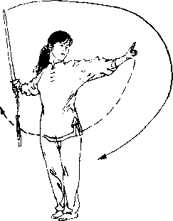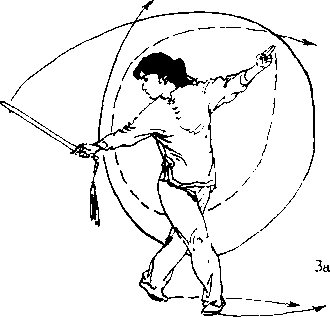 ① 右脚向前上步,屈膝,脚尖外撇,重心前 移,左脚跟离地;右手握剑向下经体右侧向上 挂剑,剑尖与眼同高,左剑指前伸,与头同高, 虎口向上;目视剑尖。(图3)② 上体左转360°;左脚向前上步,膝伸直,右脚迅速向前上步成汴少,随转体两脚脚掌向 左碾转;右卩捤剑叫>]下抡挂?周,挂负体 左侧,左剑指直臂肉卜、向上二抡一周,稍卨 鸪,乎心斜叫下; 视剑指。(图3)
