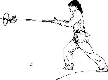 右脚向右斜前方上步,随后两脚交替向场 地的右前方行走五步成弧行步,同时左手松握 枪身中段,右手握把在胸前沿逆时针方向连续 绞枪四周。(图?)