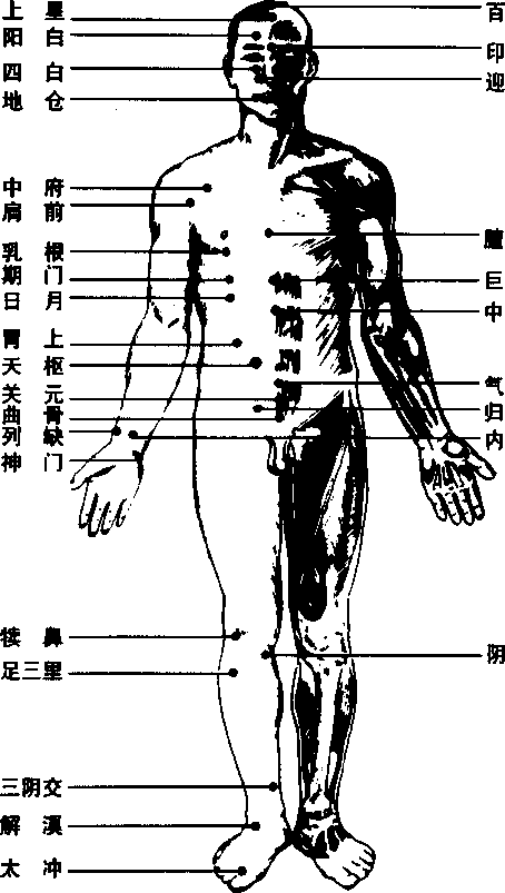 【主治】头顶痛、头眩、目昏花、咽喉痛、舌干、失音、小便不 利、大便难、小儿惊风、癲疾、霍乱转筋、下肢瘫痪、中风、中暑、 休克等急症。