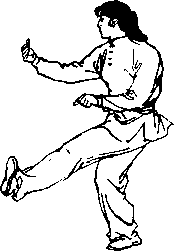 屈伸性腿法。太极拳腿法。支撑腿 微屈,站稳;另一腿脚掌用力下踩,高不过 膝。(李小杰)