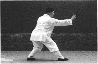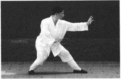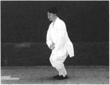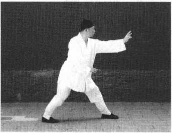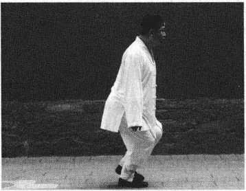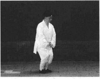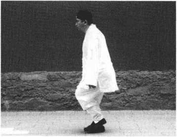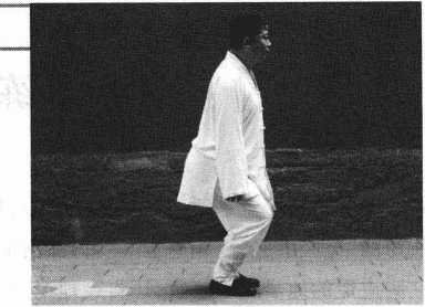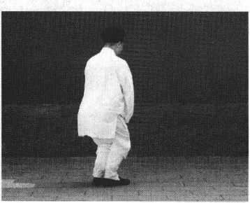 【动作十五】左脚向西方迈出 一大步,右脚随即跟进(微外斜,与左脚约成四十五度),足趾抓地 (双脚掌要如同壁虎的吸盘一样牢 牢地踏实地面),足跟有外扭之 意;两膝内扣(意念右膝尖与左 膝胭相对);两胯抱扣;两腿微曲 (似直非直,似曲非曲,如似夹