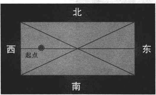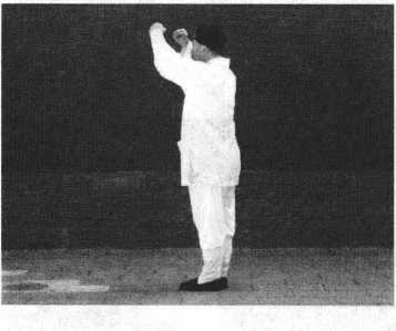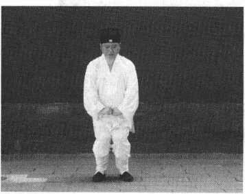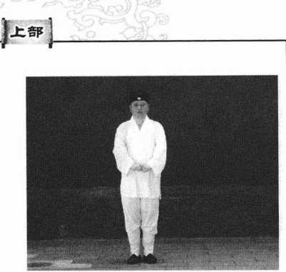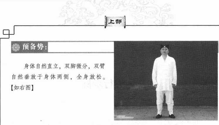 面向东方,双脚并拢,双膝内 扣,两胯平均扣劲内抱,双腿微曲, 挺腰竖脊,肩垂背圆,双手自然垂 放于身体两侧,头顶项竖,凝神静 心,目视东方。【如右图】
