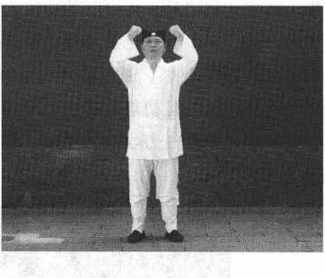 身体左转(面向南方)直立, 右脚并于左脚内侧;双掌自然下 落,从身体两侧向上划圆至头顶 变拳,同时深吸气。【如右图】