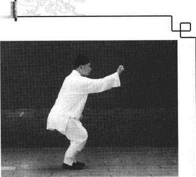 缓慢地呼气,双拳随之下按于 脐前(拳心向下,扣肩圆背,两肘 抱肋),同时双腿随拳徐徐弯曲 (并膝扣胯,挺腰竖脊,腿似弯 弓);头顶项竖,舌舐上颚,随双 拳的下落用意念导引把气聚至丹 田。【如左图】