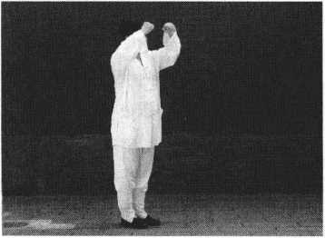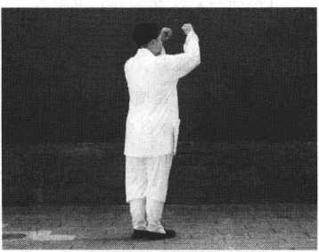 【动作十】身体向右后转(面 向西南),左脚跟靠于右脚内侧, 全身放松;双掌自然下落,从身 体两侧向上划圆至头顶变拳,同 时深吸气。【如左图】