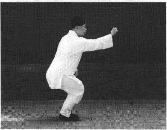 并于左脚内侧(双腿保持弯曲,并膝扣胯,挺腰圆背,足趾抓 地),同时右拳上翻,经嘴前向西 方钻出(拳心向上,臂似弯弓),带动内气上提;左拳欲提,目视 西方。【如左图】