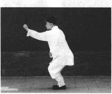 与右脚约成四十五度),足趾抓地 (双脚掌要如同壁虎的吸盘一样牢 牢地踏实地面),足跟有外扭之 意;两膝内扣(意念左膝尖与右 膝胭相对);两胯抱扣;两腿微曲 (似直非直,似曲非曲,如似夹 剪);重心落在两脚中间,挺腰竖脊(沉稳中正,不前后俯仰,不左右歪 斜);背膀平圆,两肩垂扣;左拳变掌收回,以掌内缘卡在脐部(掌心向 下,五指分开,暗用扣力,如爪如钩),左臂夹紧左肋部(裹住身体,有 后挽之意);右拳经嘴前向西方钻出,随右脚的落地翻腕变掌(掌心向前, 五指分开,食指后挑,有勾眉之意,小指与大拇指有内掐之劲,沉肩坠 肘,臂似弯弓)。头顶颈竖,下颌微收,唇闭齿扣,舌舐上颚,凝神静心, 自然呼吸,双眼从右手的虎口望向西方。【如右上图】