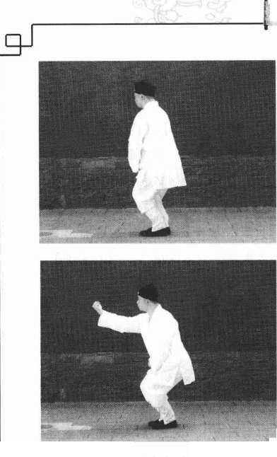 【动作+七】身体右转,左脚并于右脚内侧(双腿保持弯 曲,并膝扣胯,挺腰圆背,足趾 抓地),同时左拳上翻,经嘴前 向西方钻出(拳心向上,臂似弯 弓),带动内气上提;右拳欲提。 目视西方。