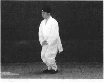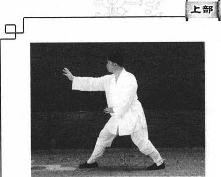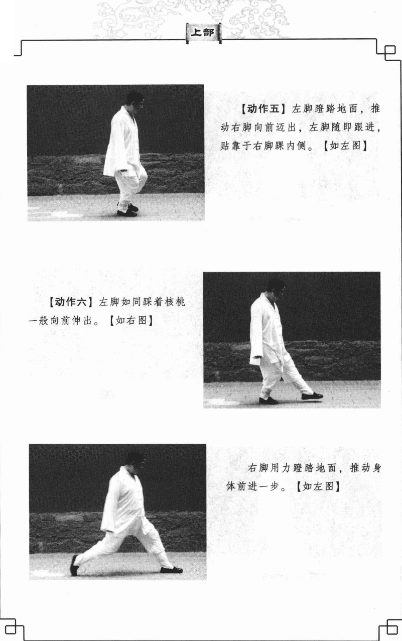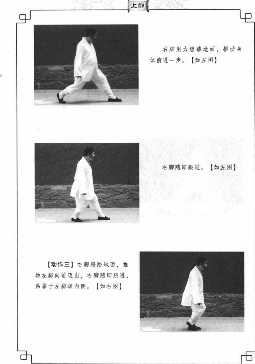 【动作九】左脚向东方迈出一 大步,右脚随即跟进(微外斜,与 左脚约成四十五度),足趾抓地 (双脚掌要如同壁虎的吸盘一样牢 牢地踏实地面),足跟有外扭之意;