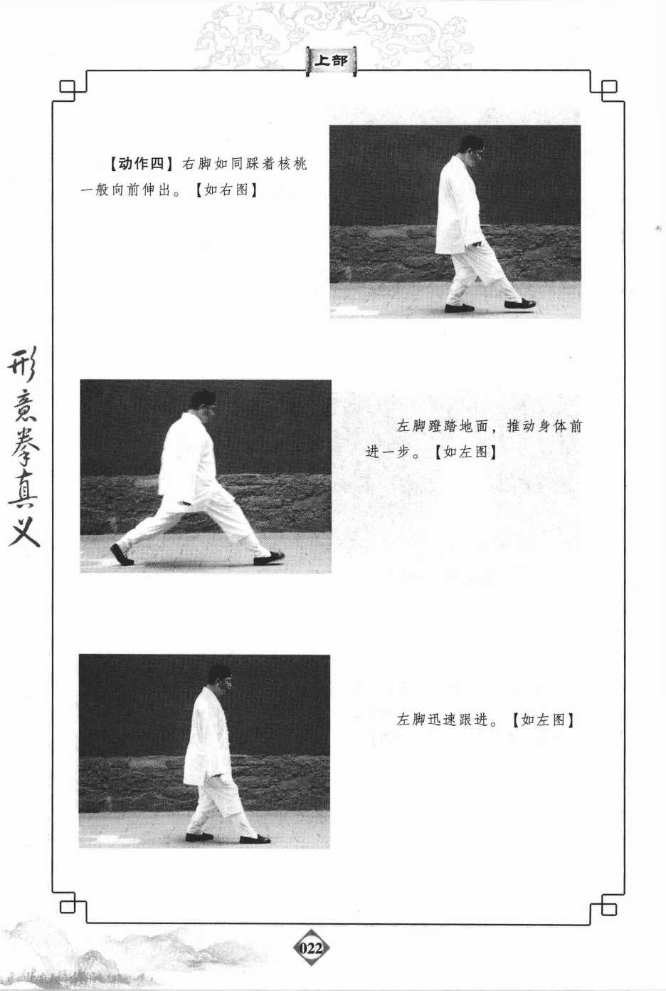 “磨胫”二字并不是简单地指大腿相磨,而是包含着两层含义:一是形 意拳讲究膝扣跨抱,腿似夹剪,不光是桩功要如此,运动中也要如此。学 者须明白,“膝扣跨抱,腿似夹剪”是针对双腿的劲道而言的,是指双腿 要有内扣合抱之劲,不要像鸭子似的两脚向外撇着、两腿张离而气浮力散, 这个“夹”是相对于“张”而言的,而不是绝对的像剪刀似的严丝合缝。 另外,在技击当中,进退迅疾,闪展灵动,如果出脚迈步都要大腿相磨是 不可能的。所以,“磨胫”说的是不论腿脚如何动作,始终要保持的是内 扣合抱之劲,劲道不可松散。在平日练功时,我们就要知道,腿是否一定 要磨擦并不重要,练出两腿的内扣之劲才是最终的目的,这不仅有助于稳 固根基,而且有助于增长腿脚的功力。其二,磨还有磨炼之意,腿脚功夫 的习练不是一天两天的事情,是需要好学者在明师的正确指点下,刻苦精 进,长修不懈,反复地锤炼,才可能取得良好的成效。这份辛苦的磨炼所 带来的不仅是功夫的增长,还有心境的修为,故此,习练者须认真对待。