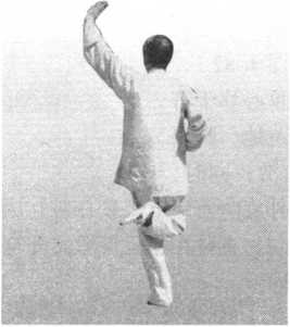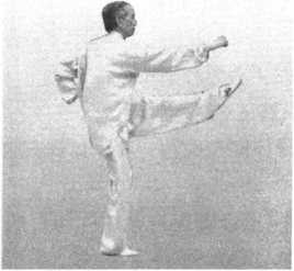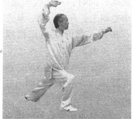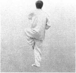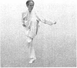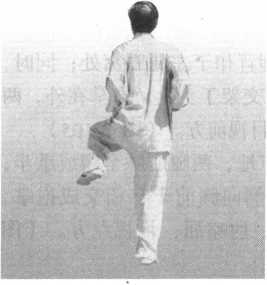 身体左转,右脚落地,腿挺直,左腿屈膝提起;同时,