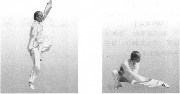 身体右后转180。,左 脚蹬地跳起;在空中,右掌 下劈,左掌上提。(图4-87)