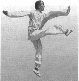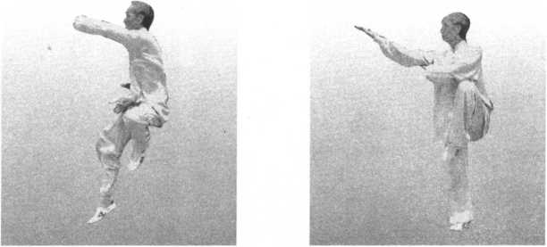 身体右转,左脚向左摆起,落地,腿挺直,右脚蹬地跳 起,并在左腿后向左撩起,脚掌朝上;同时,两掌向下经体前向