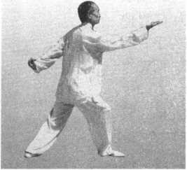 随之向前滑步,膝稍屈;同时,右掌向右平绕,臂外旋向前穿