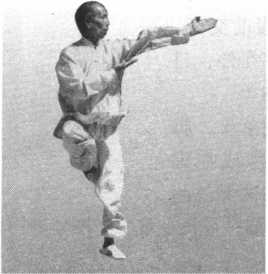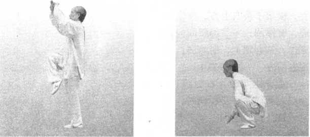 身体微左转,右腿挺直,左腿屈膝提起;左掌向下、向 左、向上、向胸前盖压,掌心朝下;右拳变掌收至腰间,掌心朝 ±;目视前