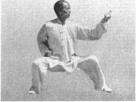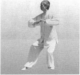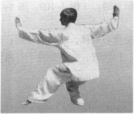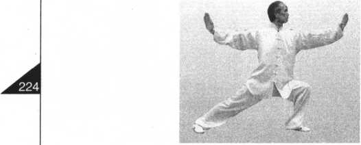 右脚跟落地,腿挺直,左腿屈膝侧抬;同时.,两掌外旋收 至腰间,掌心朝上。(图4-107 )