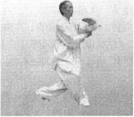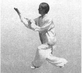 左脚前上半步,膝略 屈,右膝微屈;同时,左掌以 肘为轴,向下、向内、向上、 向前下劈捋。(图4-100)