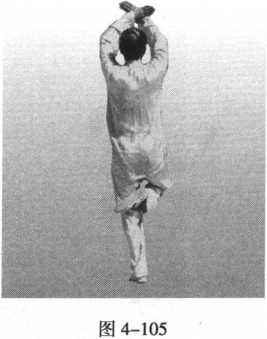 左腿挺直,右腿屈膝提起,脚背扣于左腿脂窝处;同时, 右勾手变掌,经身前上举,与左腕相交架于头上,右掌在外,两 掌心均朝前,掌指斜朝上,肘微屈;目视前方。(图4-105)