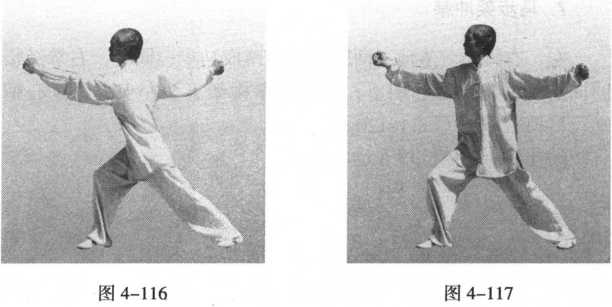 身体左转;右拳由后向前下抡劈;左拳经身前后摆。(图117)