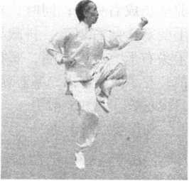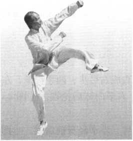 冲拳与弹腿时,拳和脚尽量在同一垂直线上,因此,需要转 腰、合胯、顺肩。