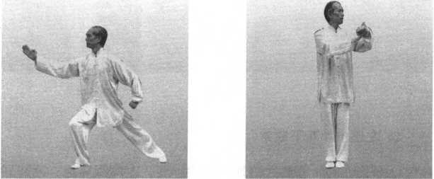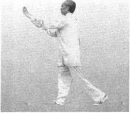 身体直立并左转,右脚 向前落步,膝略屈,左脚跟离 地,膝稍屈;同时,右掌经体 侧向前上挑起,掌心朝左,掌 指朝前;左掌弧形收至右臂内 侧,掌指朝上。(图4-90)