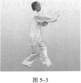 身体稍右转,右掌内 旋,横架于头右上方,掌指朝 前,臂撑圆;左掌经腰间向前 穿出,掌心朝上,肘略屈;目 视右前方。(图5-23 )