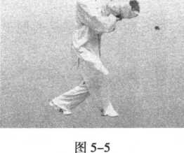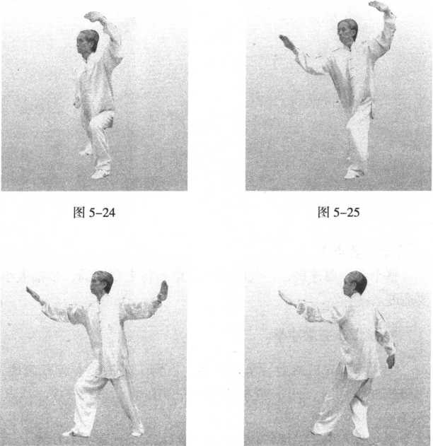 外展,右脚向前上步,两膝微屈同时,两手握拳,右拳直臂由后 向上、向前抡臂;左拳下落于体 前目视右拳。(图5-54 )身体左转左腿屈膝向左 等