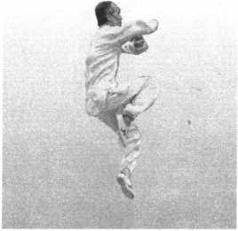 身体左转,右脚向前上步,左腿屈膝上摆,右脚蹬地跳 起;两掌经身前在头上以左掌心迎击右掌背,两肘稍屈;目视前 方。(图 5-15)