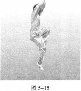 左右脚先后落地。动作不停,左腿向前摆起,右脚蹬地屈 膝跳起,身体右后转270。;同时,右手向前抓捋握拳收至腰间, 拳心朝上;左手握拳,左臂上屈,由外向内、向胸前格掩,拳心 朝内,肘略屈。(图5-17)