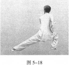 左右脚先后落地,左腿伸直,右腿屈膝成横弓步;左臂随 转体继续向右格掩;目视左前方。(图5-18、图5-18附图)