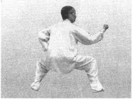 两腿屈膝半蹲成马步,身体稍左转;同时,左手握拳收至腰 间;右拳外旋,右臂上屈向胸前下压,拳心斜朝上。
