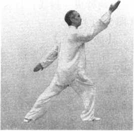 左腿蹬直成右弓步,身 体稍右转;右掌向右上方挑起, 掌指朝前上方;左掌经体前向 左后挥摆,臂直,掌指朝后下 方。(图 5-58)