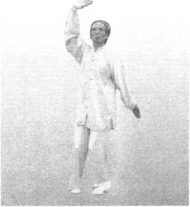 身体右转,左腿挺直,脚尖内扣朝前,右腿屈膝提起;同 时,右掌向下经体前向前上方直臂上挑,掌心朝左,掌指朝上,