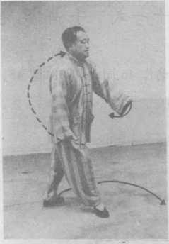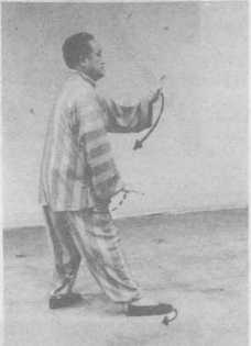动作41:重心移到左腿,身体向后直坐,右脚掌稍离地。两手