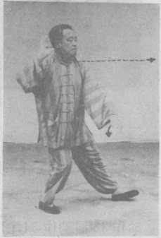 动作44:重心移到左腿,成左弓 蹬步。同时,腰带双手向左转动,身转 向正东,左手向左下弧形搂至在左胯 旁,右手向前平直推出,眼向东平视。 图44。