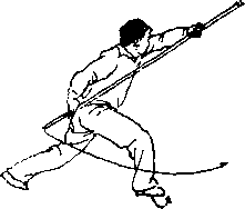 【用法】鲤鱼摆尾为下扫棍法.如上势,敌袭我上,我 撑篙进逼,迅即转袭敌下,敌如向我下部袭来,我亦可就势 下扫敌械.
