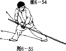 接上势,右脚向前上步成右弓左箭步,棍把仍着地,右 手握住棍梢屈臂前拉,左手随上步之势向左后分开。目视左 后方(图6—56 )。