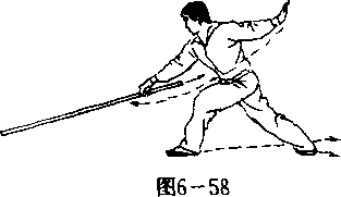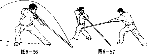 【用法】此势为闪挪诱敌之法。敌如持械向我左后扫 击,我亦可以棍格挡敌械(图6—57).