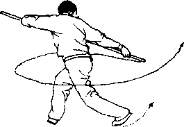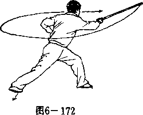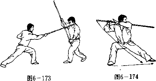 【用法】我诈输详走敌如跟进,我速转身向敌抡棍猛扫 (图6—173)。