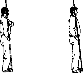同时,双手持棍,右手下放,使棍把由上向下降于右脚侧; 左手护握棍身,屈贴于胸前。目视正前方(图6—175);