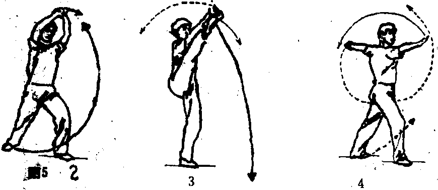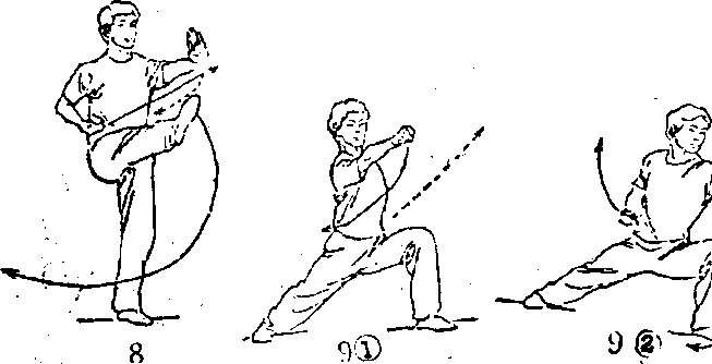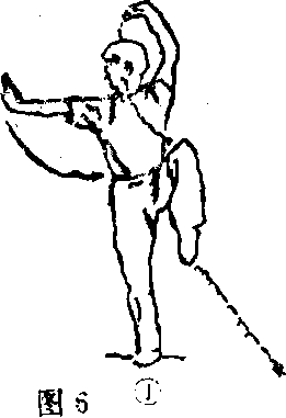 (T)身体经右向后转,右腿直立,左腿屈膝提起,同时,左掌向 下向左上方摆动,右掌向上向右侧摆动,目视右掌。(图6①)