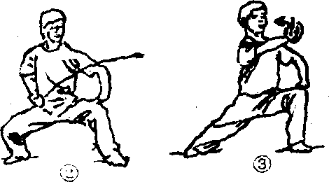 '(1)右脚向后落步成左弓步;同时,右拳向前冲出,左掌变拳收 抱于腰左侧;目视右拳。(图9①)