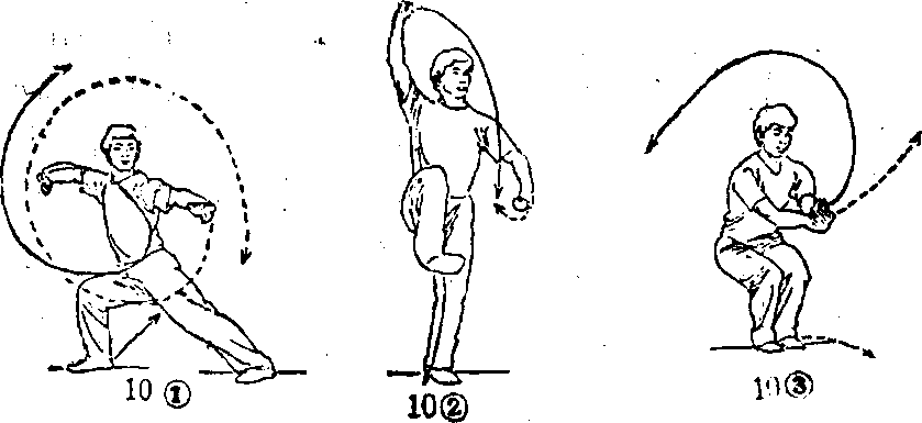 (1)重心 右移,左 脚尖内扣 成右弓 步5同时, >左拳变掌 稍下移, 右拳变掌 -右臂内旋 屈肘上 提:目视左掌。(图10①)(2)左掌向F;向右,向上,向下抡摆,右掌 经胸前向下,向右,向上摆动至右上方时握拳;同时,身体左转,左 腿直立,右腿屈膝提起;目视前方。(图10②)