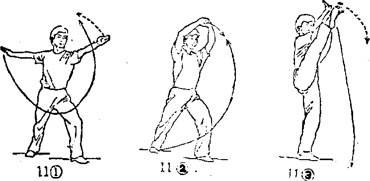 (2) 上体左转,左手上摆,右手向下向上摆起至前上方以右掌 背击拍左掌心。(图11②)