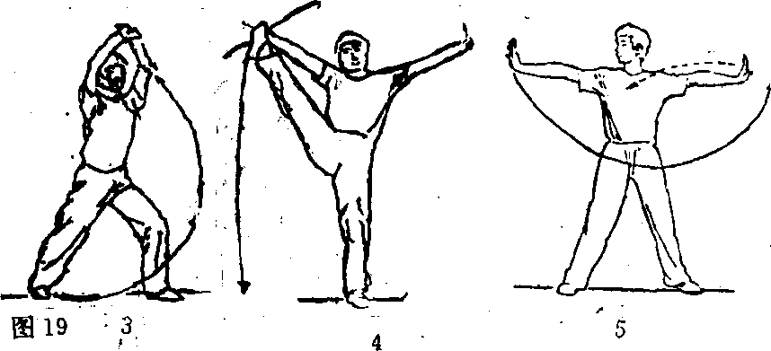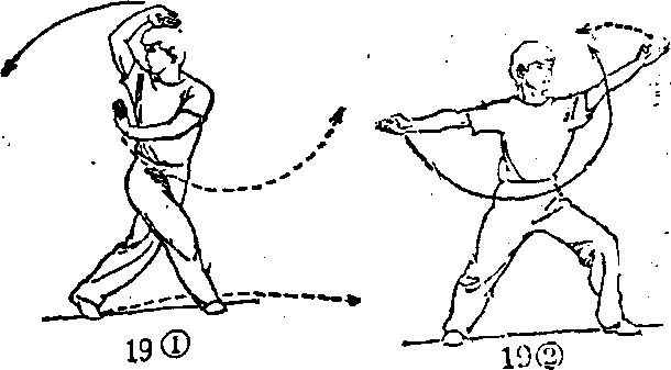 方,左掌下插于右腋下;目视右方。(图19①) ?